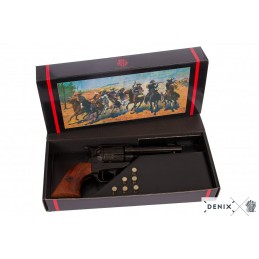 Dekorační replika, .45 caliber Peacemaker revolver 4,75", design S.Colt, USA 1873. Revolver má pohyblivý mechanizmus, lze naprázdno natáhnout a stisknout spoušť, bubínek se otáčí. Revolver je umístěn v tvrzené potištěné dárkové krabičce včetně 6 dekoračních nábojů, které lze do revolveru vložit.