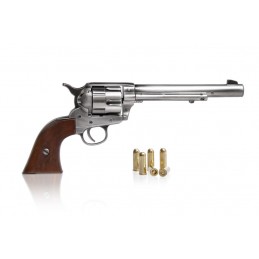 Replika revolveru ráže .45 Peacemaker 1873 v dárkové kazetě s náboji. Revolver je vyroben z kovu a povrchová úprava zbraně je v provedení nikl. Střenky jsou dřevěné. Replika má otočný bubínek a funkční natahování.