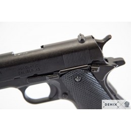 Replika pistole Government M1911A1 vyrobená z kovu a se střenkami z tvrzeného plastu, se simulovaným mechanizmem pro nabití a výstřel. Zásobník nelze vyjmout, natahování zbraně je funkční.