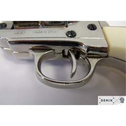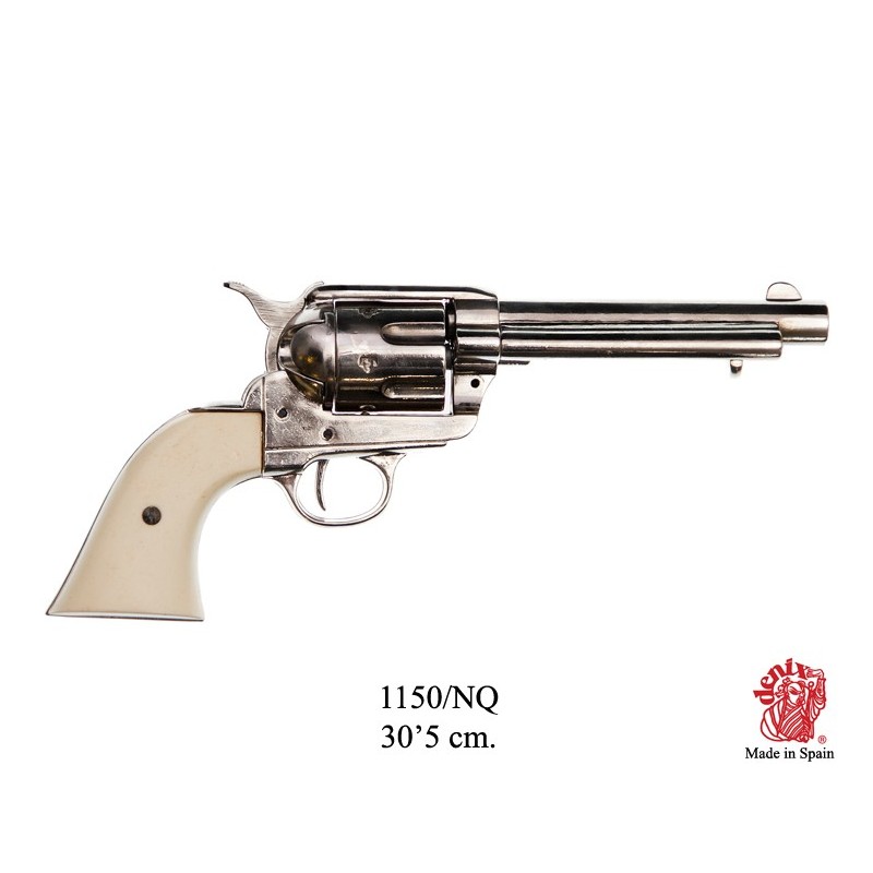 Replika coltu .45 Peacemaker, USA 1873. Mechanizmus zbraně je pohyblivý, bubínek se otáčí. Lze vložit dekorační náboje. Vyrobeno v niklové povrchové úpravě.