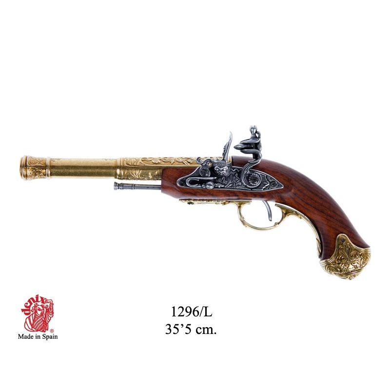 Dekorační replika, anglická pistole z 18. století. Mosazná povrchová úprava.
