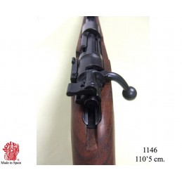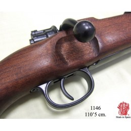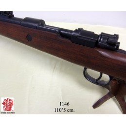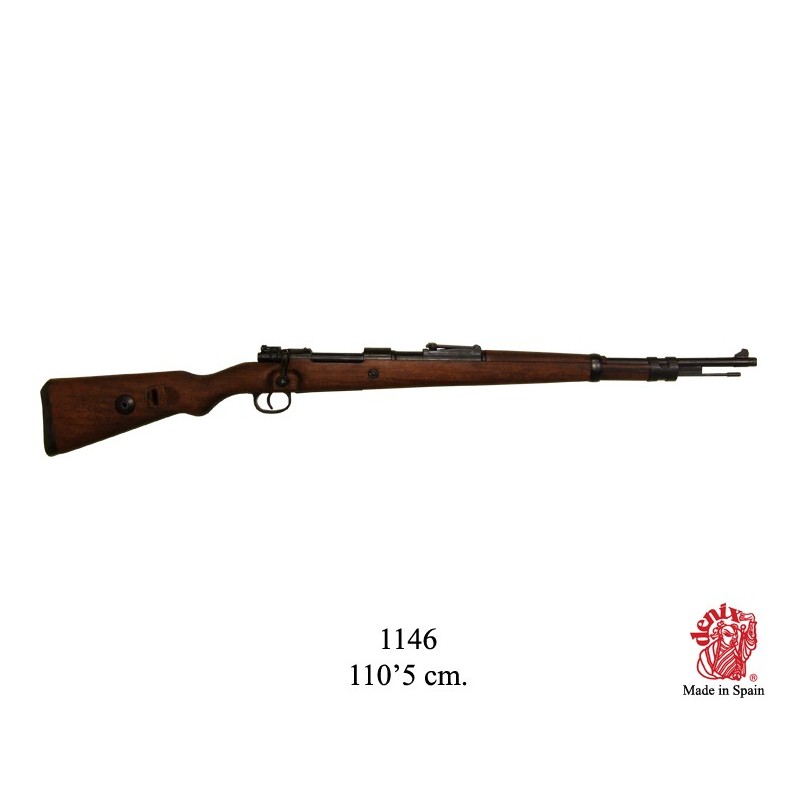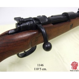 Dekorační replika německé útočné pušky, Karabina Mauser 98k. Mechanizmus zbraně je pohyblivý. Replika lze naprázdno natáhnout a po stisknutí spouště zbraň cvakne. Karabina 98K byla používána za 2. světové války a byla základní pěchotní zbraní německé armády.