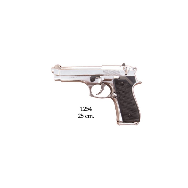 Dekorační replika, pistole Beretta model 92 F, 9 mm. Pistole má pohyblivý mechanizmus. Je možné naprázdno natáhnout a po stisknutí spouště replika cvakne. Zásobník je vyjímatelný. Po stlačení pojistky lze velmi jednoduše vyjmout a zase vložit. Vyrobeno v niklové, povrchové úpravě.