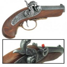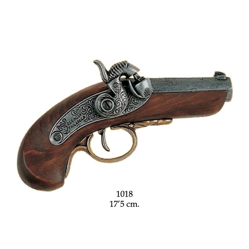 Dekorační replika, Deringer, Filadelfie, z roku 1850. Celková délka je 17,5 cm. Replika má pohyblivý mechanizmus. Lze použít kapslíky pro imitaci střelby.