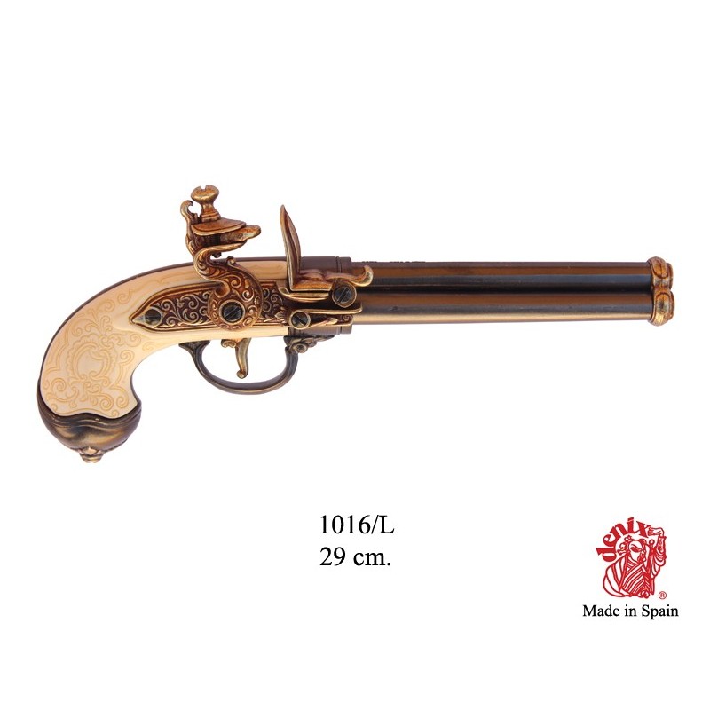 Dekorační replika, trojhlavňová pistole s křesacím zámkem. Pistole má pohyblivý mechanizmus, po natáhnutí a stisknutí spouště maketa cvakne. Vyrobeno v mosazné povrchové úpravě.