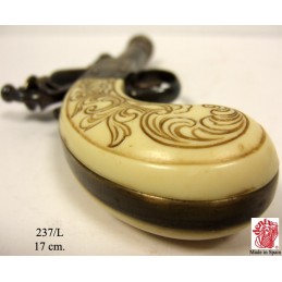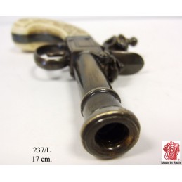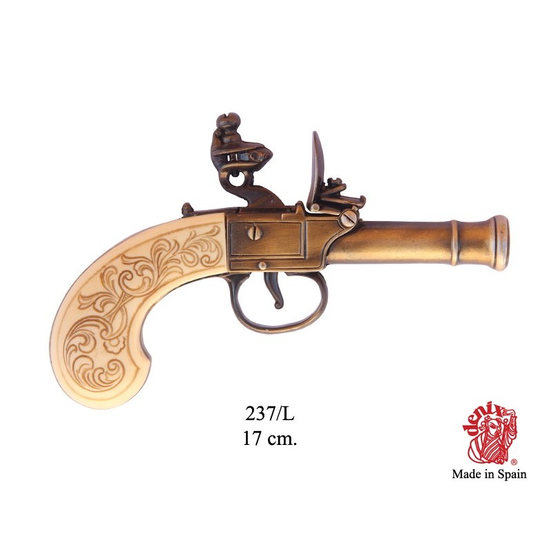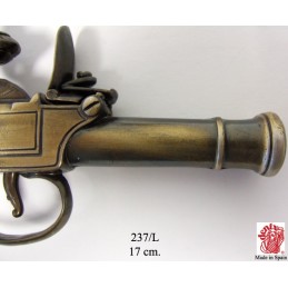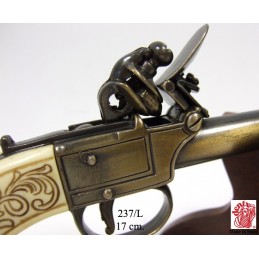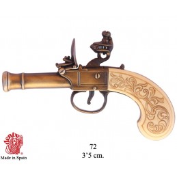 Dekorační replika, rukávníková pistole s křesacím zámkem od Bunneyho z Londýna okolo roku 1770. Pistole má pohyblivý mechanizmus, po natáhnutí a stisknutí spouště replika cvakne. Vyrobeno v mosazné povrchové úpravě.