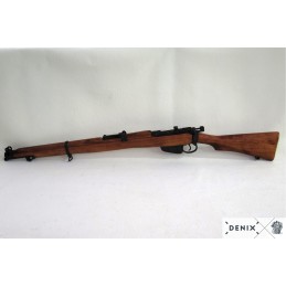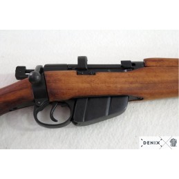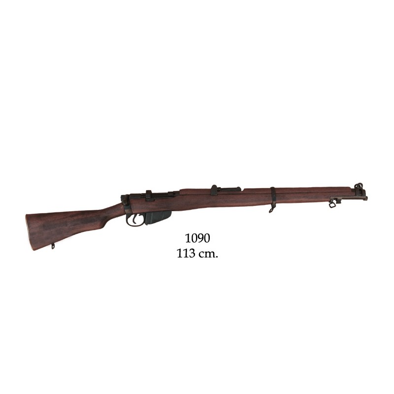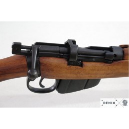 Dekorační replika pušky Lee Enfield MK III, Anglie, 2. světová válka. Puška má pohyblivý mechanizmus. Lze naprázdno natáhnout a po stisknutí spouště replika cvakne. Zásobník je vyjímatelný.