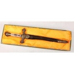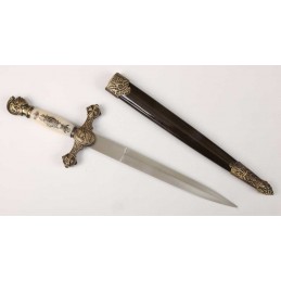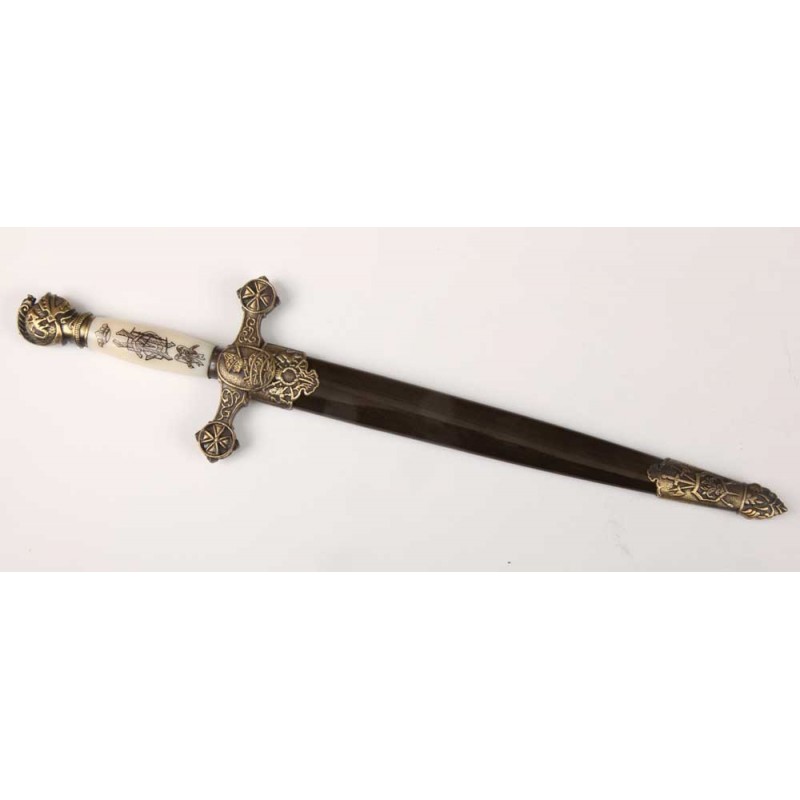 Dekorační replika rytířské dýky. Rukojeť v imitaci slonoviny. Dodáváno včetně pochvy.