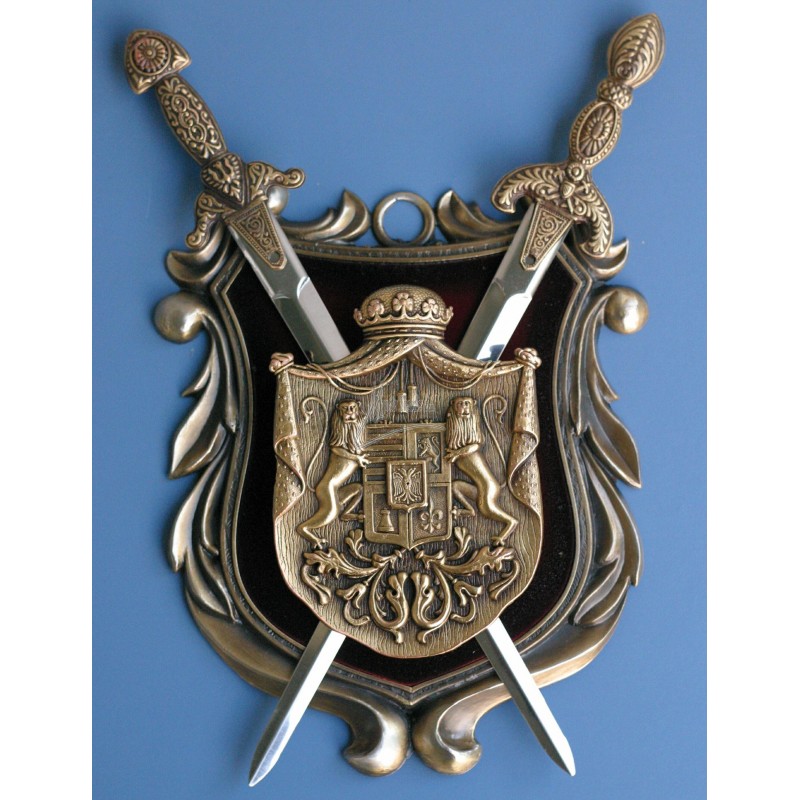 Dekorační replika, erb zdobený meči Excalibur a El. Cid.