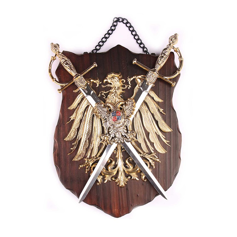 Replika erbu se dvěma zbraněmi na dřevěné desce.