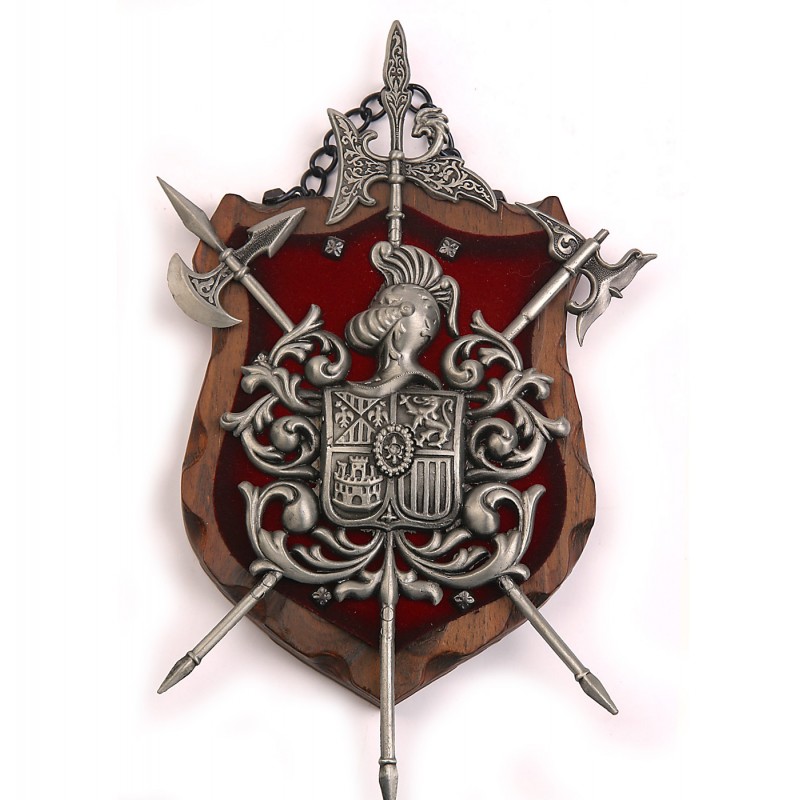 Replika stříbrného erbu se dvěma zbraněmi na dřevěné desce.