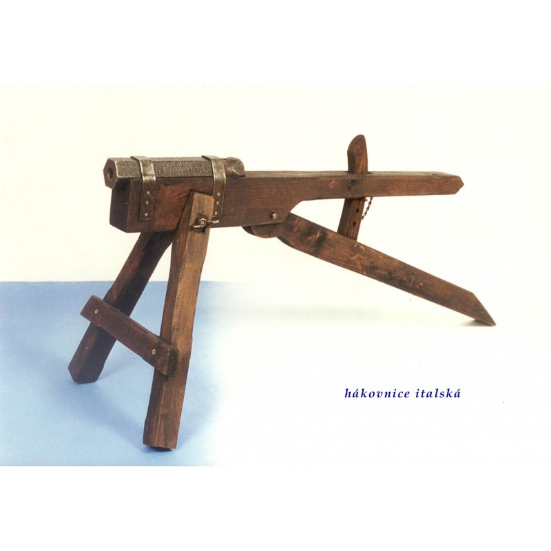 Replika hákovnice - Hákovnice byly především ruční palné zbraně s robustnější, většinou šestihrannou ocelovou nebo bronzovou hlavní o ráži 20 – 30 mm. Jejím charakteristickým rysem byl kovový výstupek pod ústím hlavně - HÁK, který střelec zaklesl při palbě o hradební zeď nebo stěnu bojového vozu, a tak zachycoval velký zpětný ráz zbraně při výstřelu. V tomto případě jde o lafetovanou hákovnici z oblasti Itálie.