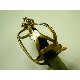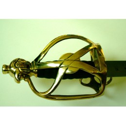 Der Messingset, die geplättete Klinge. Preußische Dragoner waren im 18. Jahrhundert ausgerüstet mit diesen Degen mit mächtigen Körben über vier Sprossen. Kreuzung der Sprossen ist geschmückt mit Kreistarget. Holzhandgriff ist horizontal geschlitzt und mit Leder überzogen. Prunkvollere Offizierswaffen trugen ein Königsmonogramm FR – Fridericus Rex. Dieser Typ von den Waffen wurde von der Königpreußischen Manufaktur in Postupim sechzig Jahre lang erzeugt.