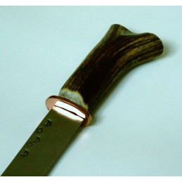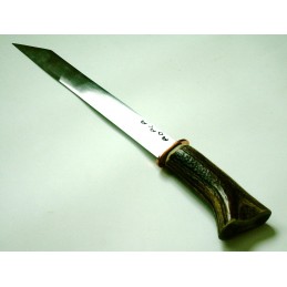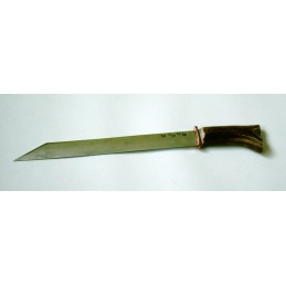 Nůž Scramasax je funkční nůž s pevnou čepelí. Ruční výroba. Délka rukojeti: 100 mm, šířka čepele: 40 mm a celková délka: 415 mm. Čepel je z černé oceli, kování mosazné nebo bronzové, střenka z jeleního parohu.