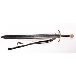 Replika křižáckého meče včetně kožené pochvy s páskem. Meč je vyroben z oceli, s mosazným jílcem a s koženou rukojetí.