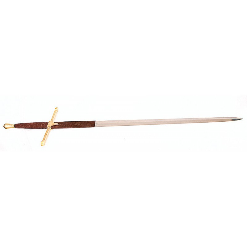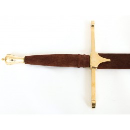 Dekorační replika historického obouručního meče. Rukojeť meče a horní část čepele je omotána hnědou semiší a meč je doplněn mosaznými prvky.