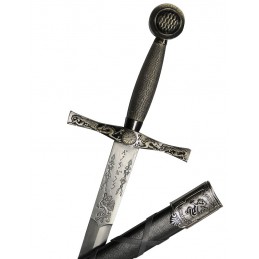 Dekorační replika zdobeného meče Excalibur krále Artuše. Meč je vyroben v niklové povrchové úpravě a je dodáván včetně tmavé pochvy.