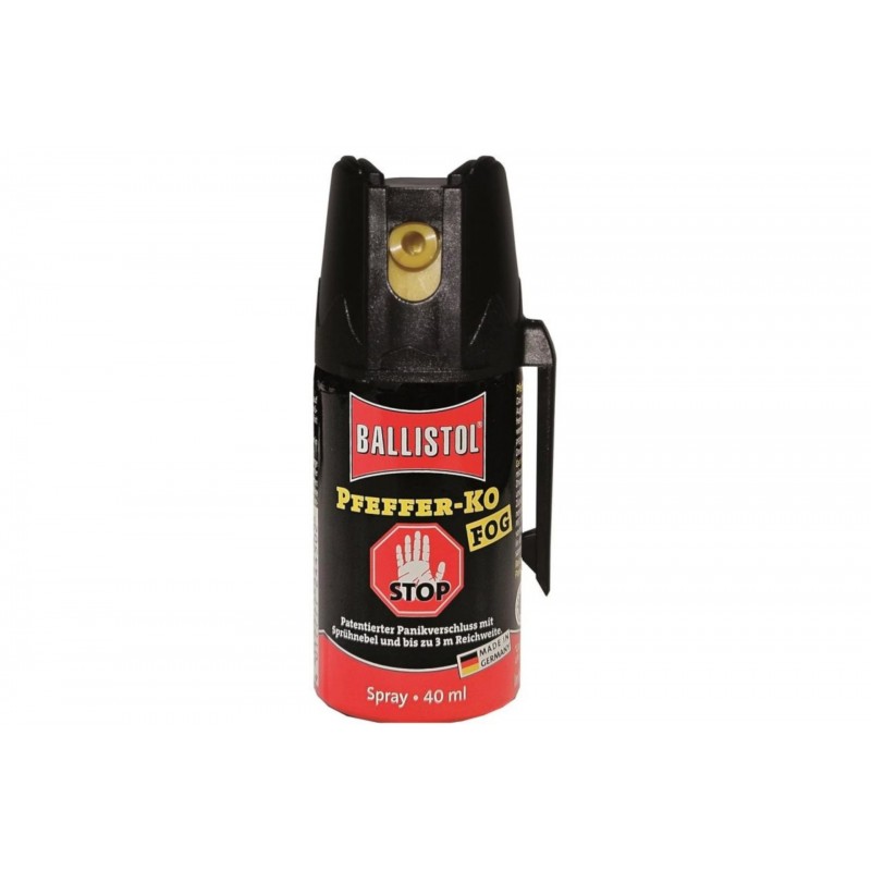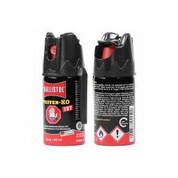 Pepřový sprej Ballistol KO JET je účinný obranný prostředek proti napadení ze strany člověka i agresivních zvířat. Po stisknutí spouště s bezpečnostní pojistkou tryska typu JET vypouští soustředěný paprsek přírodního extraktu kajenského pepře (Oleoresin Capsicum) až do vzdálenosti cca 4 metrů. Dráždivá látka způsobuje silné pálení očí, dočasné oslepení a podráždění dýchacích cest, které se projevuje kašlem – tím získáte čas potřebný k úniku.