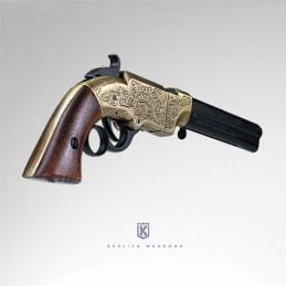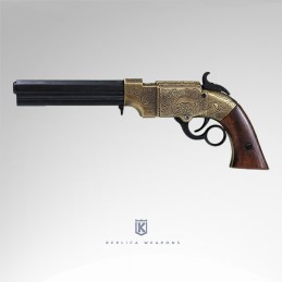 Dekorační replika opakovací pistole Volcanic 1854. Mechanizmus zbraně je pohyblivý. Vyrobeno v mosazné povrchové úpravě s rytinami, hlaveň je černěna.