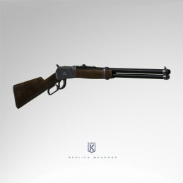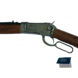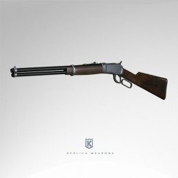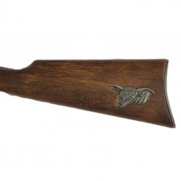 Replika pušky Winchester 1892 ve stříbrném provedení od společnosti Kolser. Spodní natahovací páka je pohyblivá, po stisknutí spouště zbraň cvakne. Pažba je zdobena podobiznou býka.