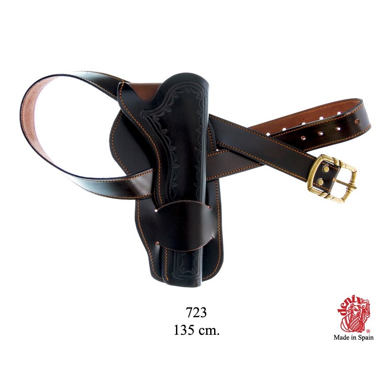 Westernový kožený opasek s pouzdrem na 1 revolver, 135 cm. Holster je vhodný pro revolvery s delší hlavní, ideální je pro 12 palcové kolty.