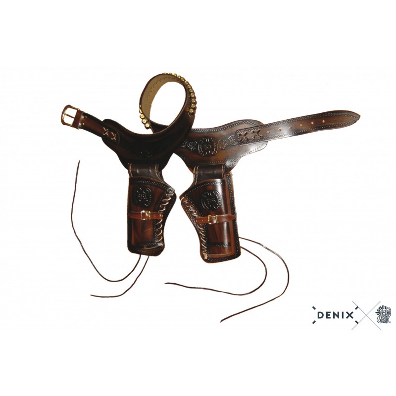 Westernový holster, opasek s pouzdrem na 2 revolvery. Na tento Westernový holster lze připevnit 23 dekoračních nábojů, které jsou součástí balení. Westernový opasek je vhodný pro revolvery z naší nabídky.